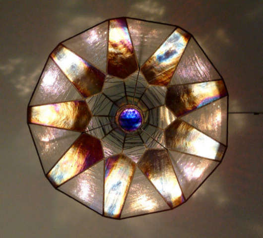 La lampe à réflecteur Big Halogen doit servir ici d'indication à mes autres formes de lampes car je crois qu'avec les colonnes agate, j'ai un peu exagéré sur Light2Art. C'est pourquoi ici un réflecteur fabriqué sans moule. L'effet à la vue directe est bien réussi, les couleurs sont difficiles à rendre au plafond. Le réflecteur se compose d'une partie et a été assemblé à partir de 30 morceaux de verre iridescent. Afin que la forme soit assez symétrique, toutes les pièces ont été polies exactement sur onglet.